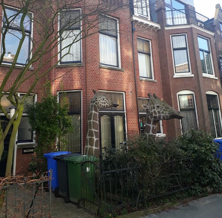 Vandaag zag ik tijdens mijn dagelijkse ommetje door de wijk opeens twee giraffen. Ja, ik moet zeggen dat ik er zelf ook verbaasd over was. Ze stonden gewoon in de straat, iets verderop. ‘Goh, je zou ze maar opeens in je tuin aantreffen’, schoot er door me heen. De giraffen zelf trokken zich overigens nergens iets van aan en lieten verraste voorbijgangers in alle rust passeren.